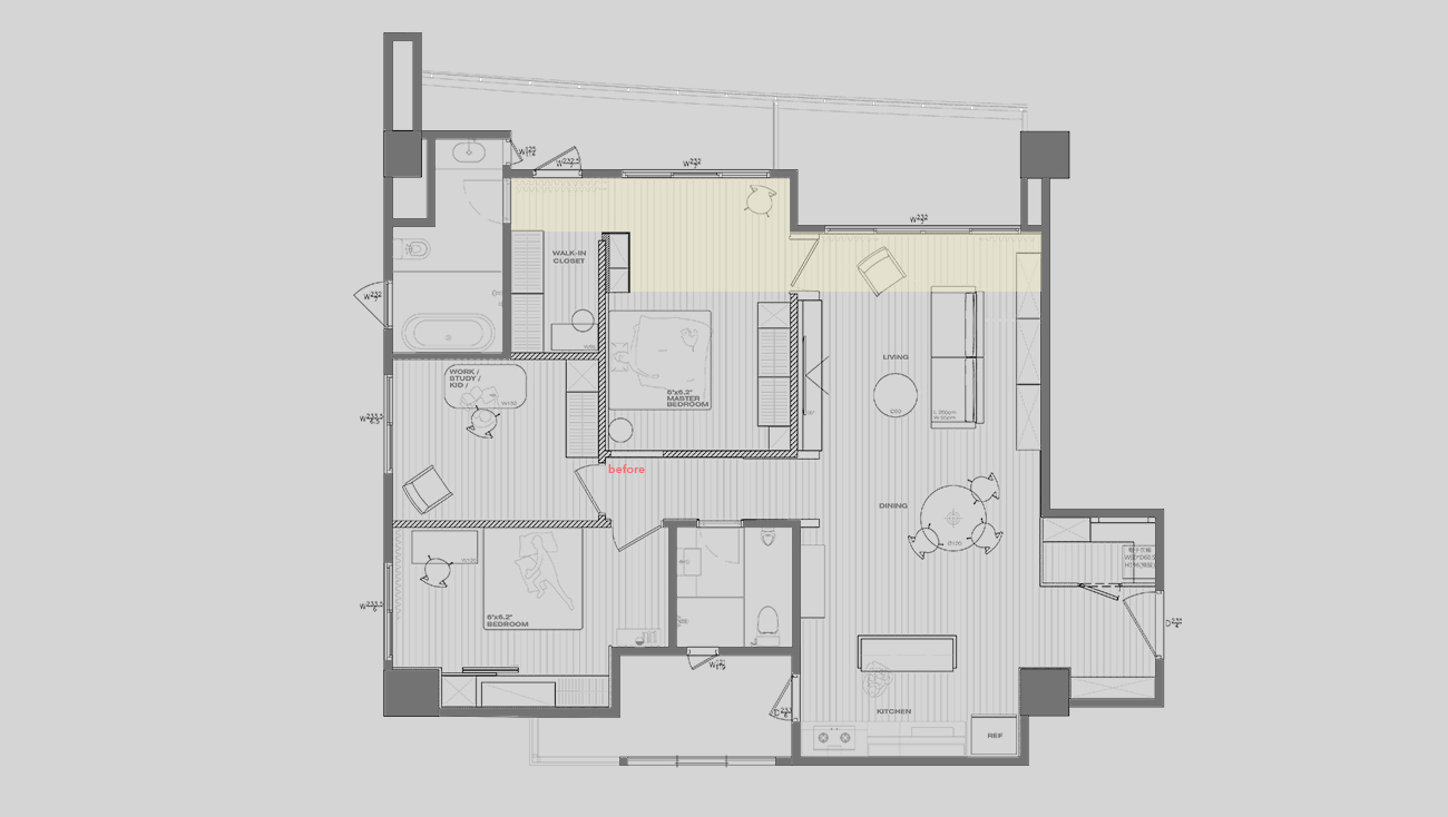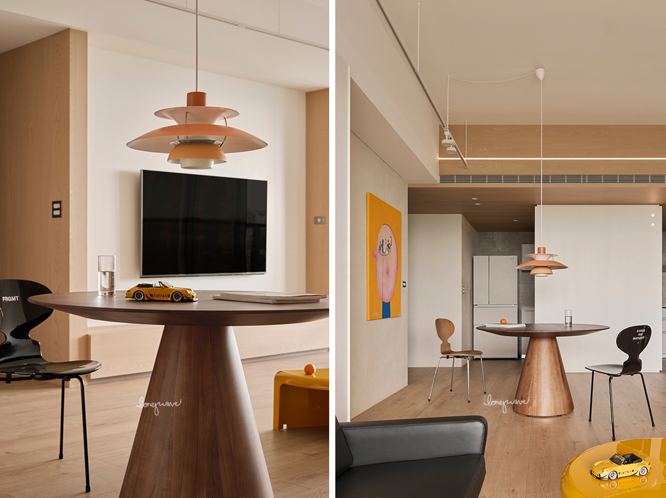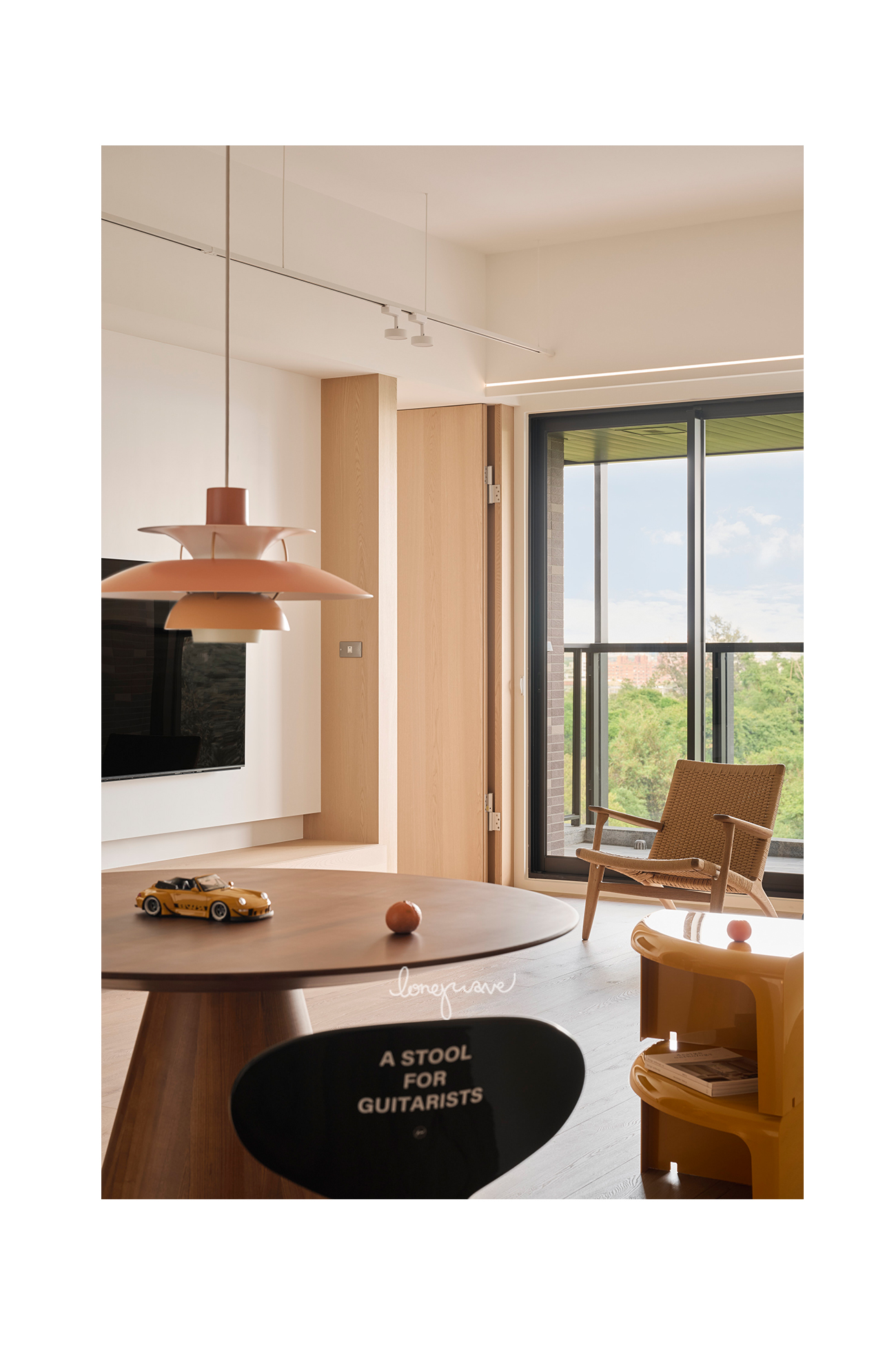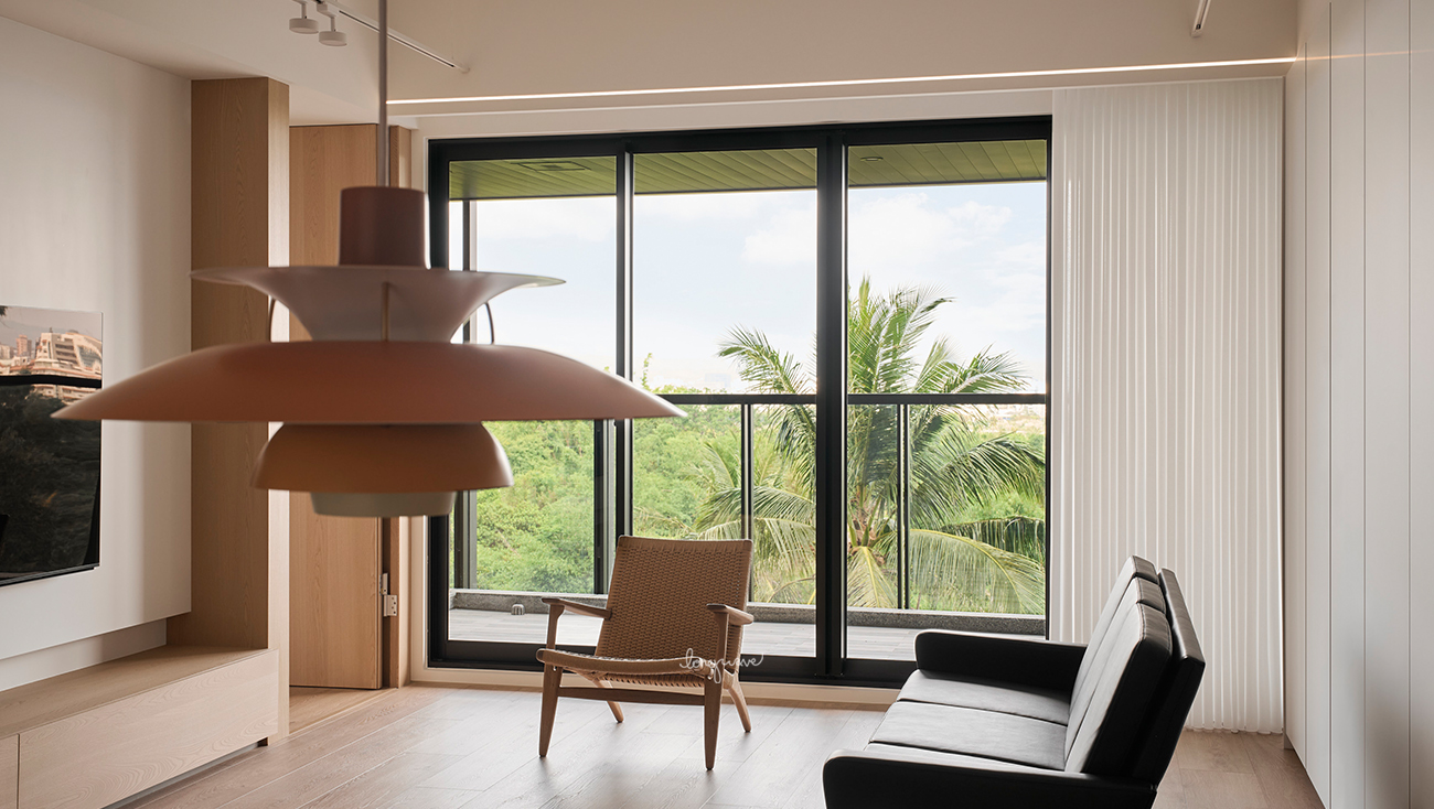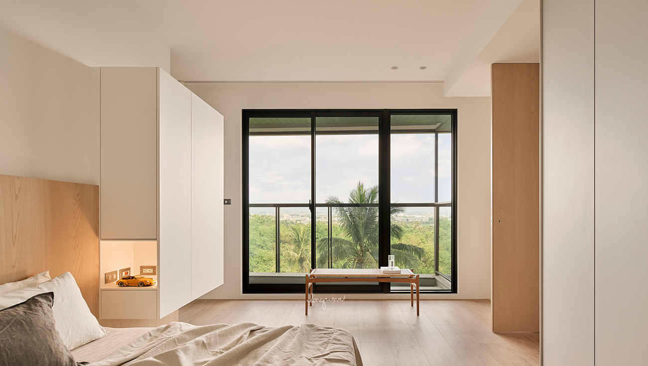 在平面提案階段調整主臥門位置,解決原本與客用衛浴及廊道正對的格局問題,更希望將這片窗外的綠意延續。從主臥延伸至客廳是一道8米的窗景引入室內。