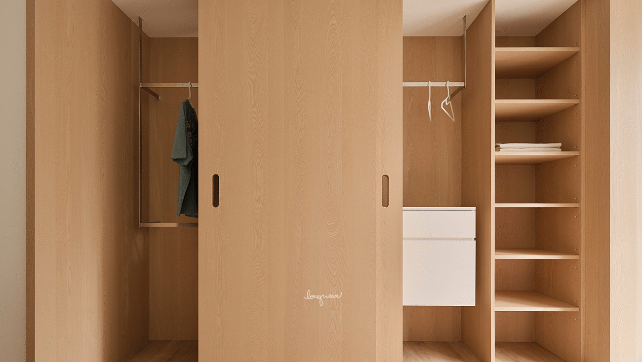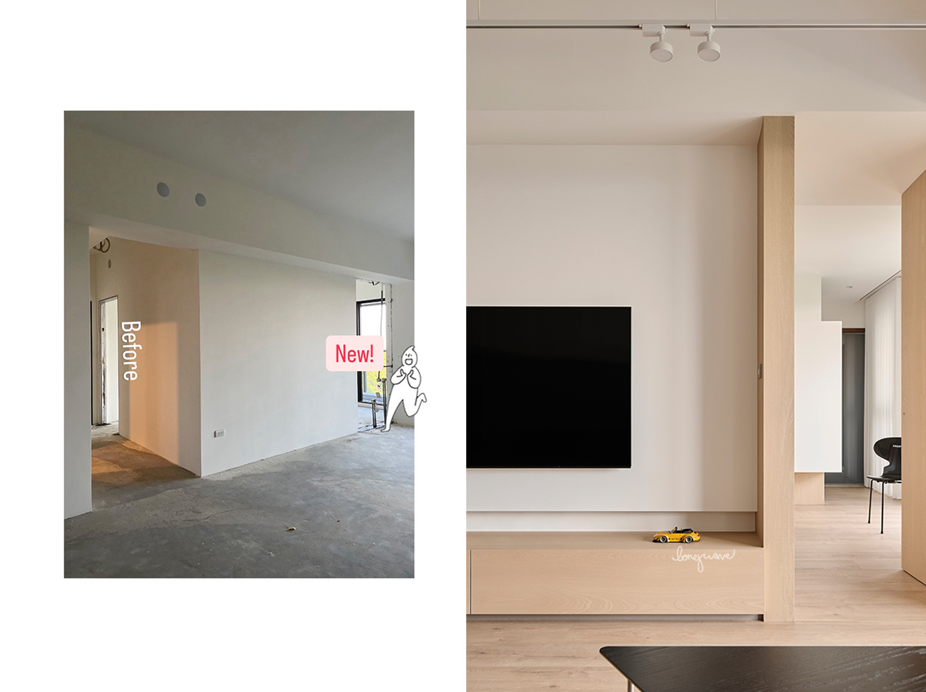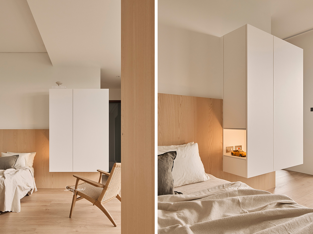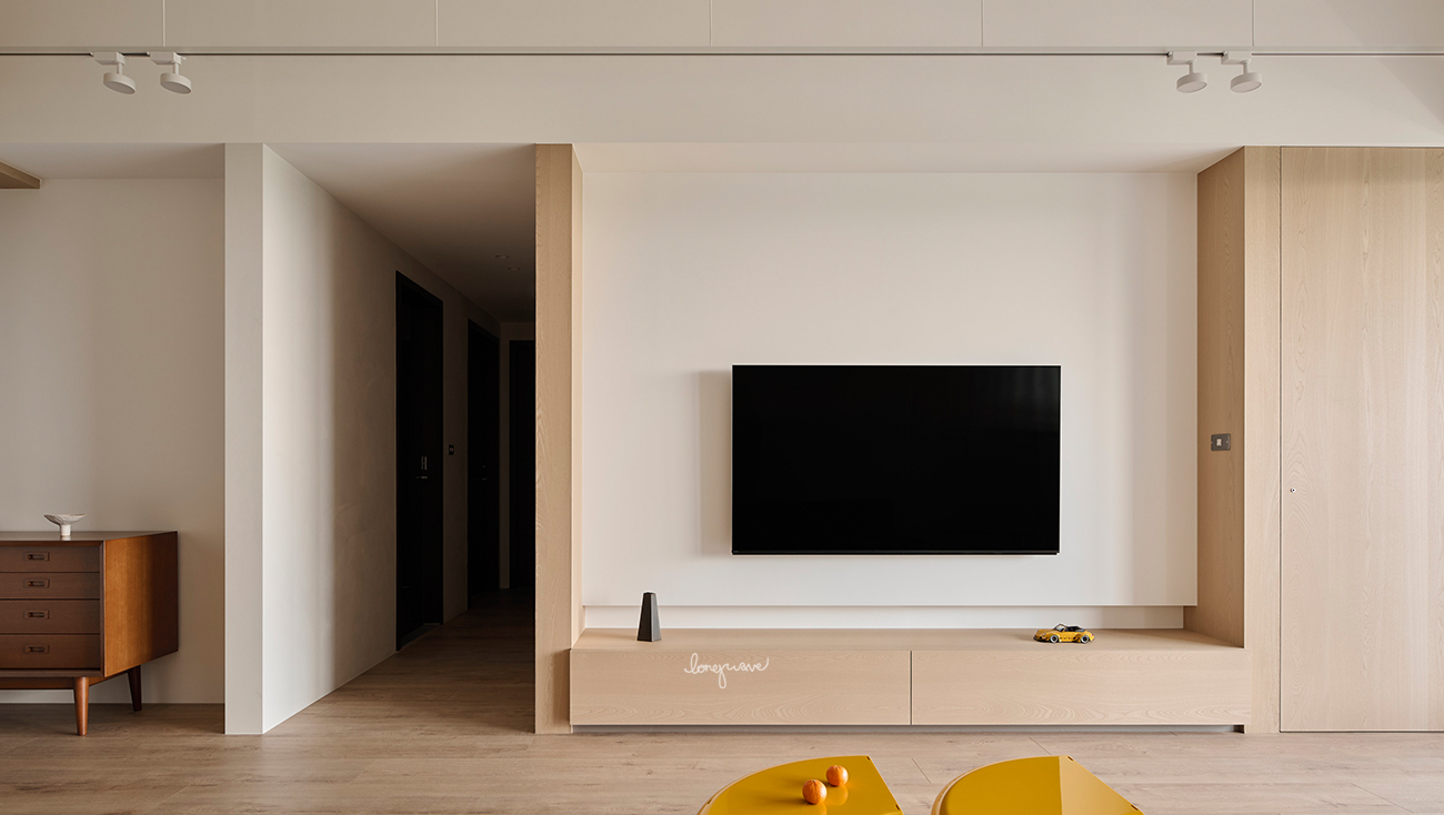 主臥新設的入口門與電視牆合體,使門扇開啟時成為一幅流動的風景,而闔上時則是成為電視牆延伸量體的一部分。